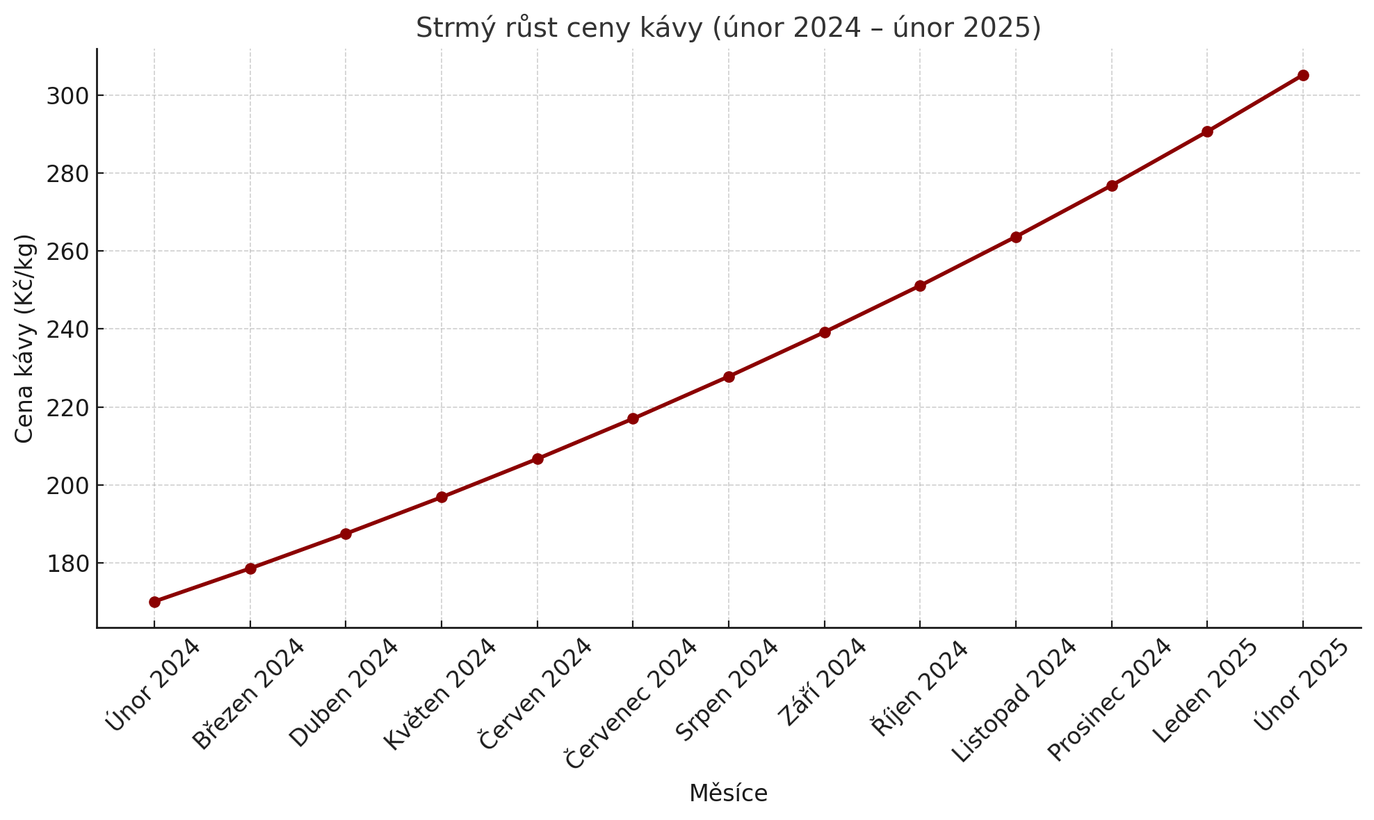 Růst nebyl rovnoměrný – čím blíže k roku 2025, tím strmější stoupání. V únoru 2025 byla cena kávy již téměř dvojnásobná oproti začátku roku 2024.
