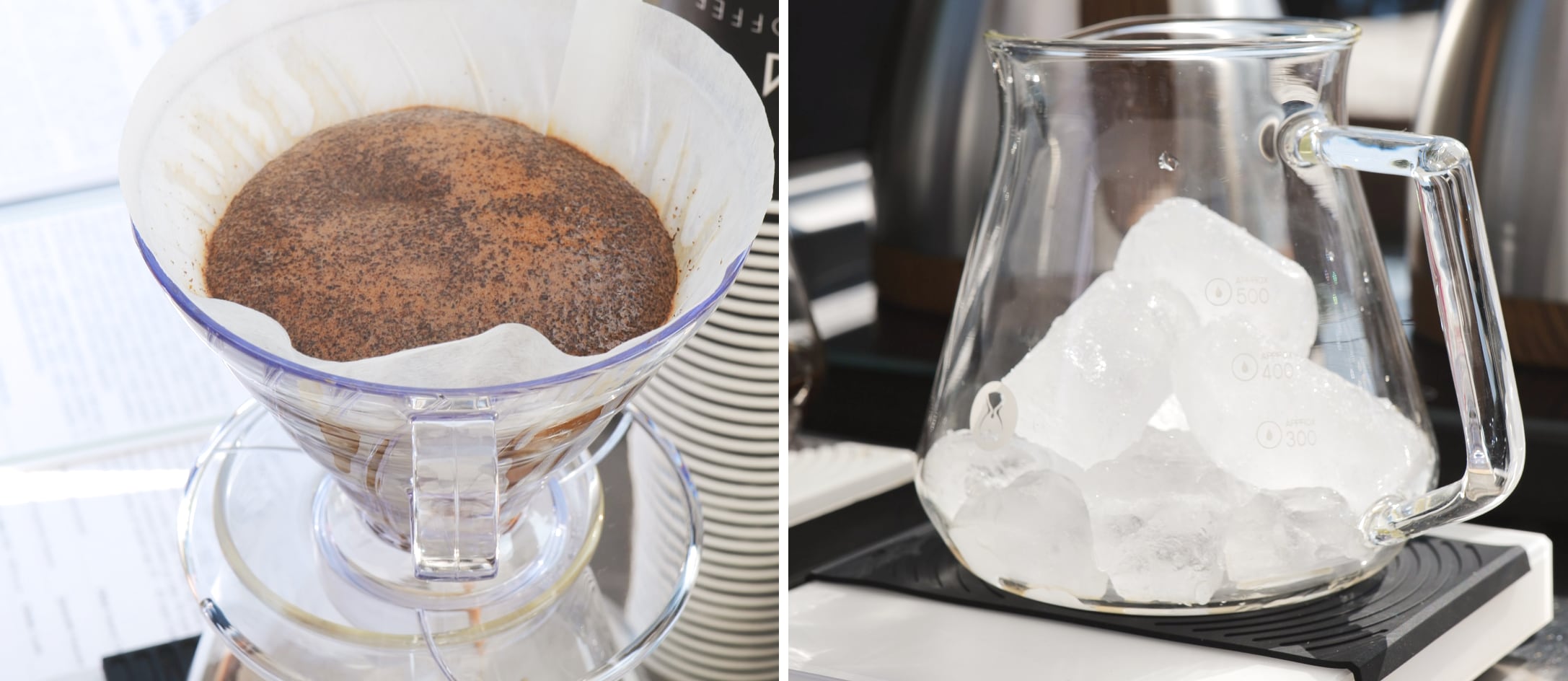 Zapněte konvici s vodou. Zatímco se voda ohřívá, prolijeme filtrační papír horkou vodou nad dřezem, aby jsme se zbavili případné papírové chuti. Naplníme dekantér ledem a umístíme do V60 filtr. Do filtru nasypeme 35g kávy a zarovnáme, aby káva ve filtru byla rovnoměrně rozprostřená.